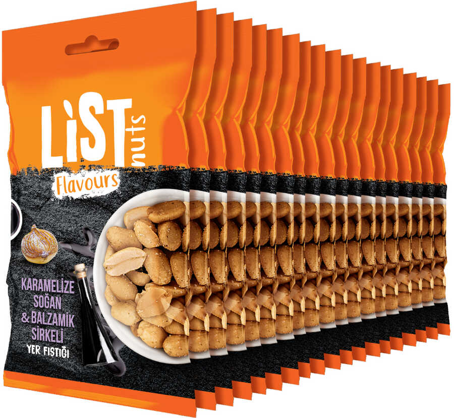 Karamelize Soğan & Balzamik Sirkeli Yer Fıstığı 20 x 30 g, yer fıstığının dolgun tadını karamelize soğanın isli tatlılığı ve balzamik sirkenin ferah asiditesiyle birleştiren 20'li bir gurme setidir. List Flavours serisinin bu imza lezzeti, daha önce hiç tatmadığınız bir aroma profilini 30 gramlık pratik paketlerde sunar. Tatlı, ekşi ve tuzlu notaların dengesiyle damaklarda gerçek bir lezzet patlaması yaratır.