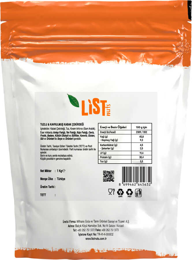 List Nuts Kavrulmuş Kabak Çekirdeği, sağlıklı bitkisel protein kaynağıdır. Kalp ve damar sağlığının normal fonksiyonunu destekler. Kabak çekirdeği magnezyum alımınıza destek sağlar.List Nuts Kavrulmuş Kabak Çekirdeği, çay ve meşrubatlarla birlikte çerez olarak tüketilebilir veya ekmek, kurabiye ve diğer hamur işleri yapımında kullanmayı tercih edebilirsiniz.Üretim tesisimizde titiz eleme, ayıklama ve analiz işlemlerinden sonra sizin için özenle paketliyoruz.Enerji ve Besin Değerleri (100g için) :• Enerji : 552 kcal• Yağ : 45,8 g• Doymuş Yağ : 9,3 g• Karbonhidrat : 4,5 g• Şekerler : 2,5 g• Lif : 11,4 g• Protein : 30,4 g• Tuz : 3,3 gTeslimat Bilgisi:2