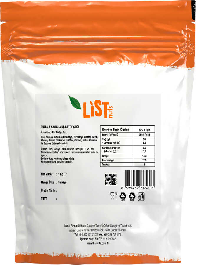 Tuzlu Kavrulmuş Siirt Fıstığı 1 Kg, Siirt bölgesinin iri taneli, dolgun ve kendine has aromasıyla ünlü fıstıklarının, profesyonel kavurma teknikleriyle işlenip tuzlanmasıyla elde edilen gurme bir kuruyemiş seçeneğidir. List Nuts kalitesiyle sunulan bu ürün, Siirt fıstığının Antep fıstığına göre daha iri olan yapısını ve karakteristik tadını 1 kilogramlık avantajlı paketinde sunar. Kolay açılan kabukları ve dolgun iç yapısıyla kuruyemiş severlerin favori tercihlerinden biridir.