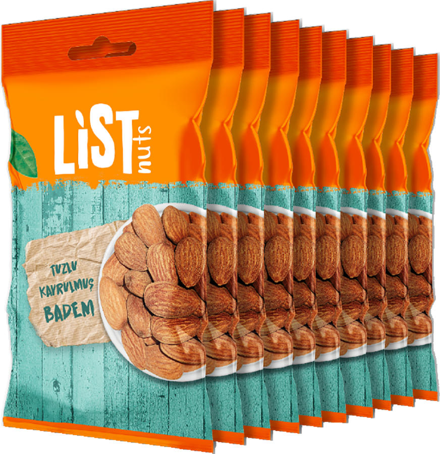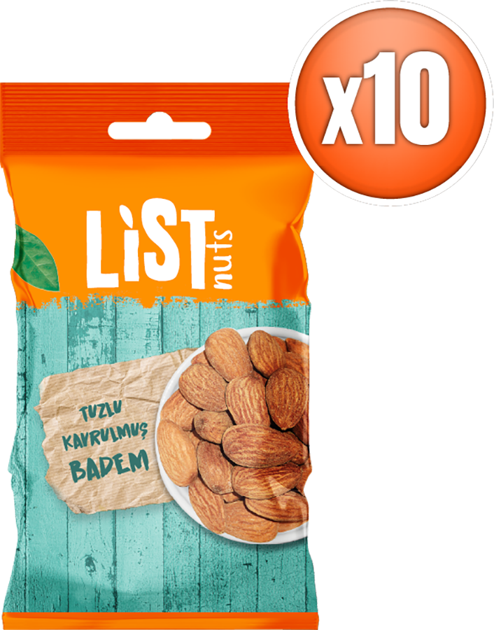 List Nuts Kavrulmuş Badem, zengin E vitamini içeriği ve uzun süre tokluk hissi yaratan yapısı sayesinde, sağlıklı ara öğünleriniz için ideal bir kuruyemiştir. Badem, kalp ve damar hastalıklarını önlemeye katkıda bulunur. 1 porsiyon badem (28g), günlük E vitamini ihtiyacınızın %37'sini karşılamaktadır.List Nuts Kavrulmuş Badem, çay ve meşrubatlarla birlikte çerez olarak tüketilebilir veya çikolata, puding, pasta, kek, kurabiye ve hatta Türk mutfağının eşsiz yemeklerinin yapımında kullanmayı tercih edebilirsiniz. İsterseniz de kendi badem sütünüzü veya ezmenizi yapmak için kullanabilirsiniz.Üretim tesisimizde titiz eleme, ayıklama ve analiz işlemlerinden sonra sizin için özenle paketliyoruz.10 Adet 40 gramlık paket gönderilecektir.Enerji ve Besin Değerleri (100g için) :• Enerji : 552 kcal• Yağ : 48,9 g• Doymuş Yağ : 4,2 g• Karbonhidrat : 6,8 g• Şekerler : 6,4 g• Lif : 17,5 g• Protein : 21,2 g• Tuz : 1 g