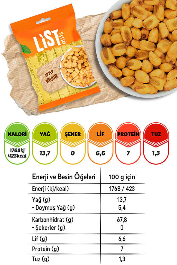 Üretim tesislerimizde titiz eleme, ayıklama ve modern kavurma teknikleriyle hazırlanan dolgun mısır taneleri, film gecelerinden maç saatlerine kadar her sosyal aktiviteye heyecan katar. 75 gramlık mini paketler gün boyu yanınızda taşımak için pratik bir enerji kaynağı oluştururken, 180 gramlık büyük paketler paylaşımlı sofralar için idealdir. Hijyenik standartlarda analiz edilerek paketlenen List Nuts Tuzlu Mısır, çıtırtı arayanların vazgeçilmez durağı olacaktır.