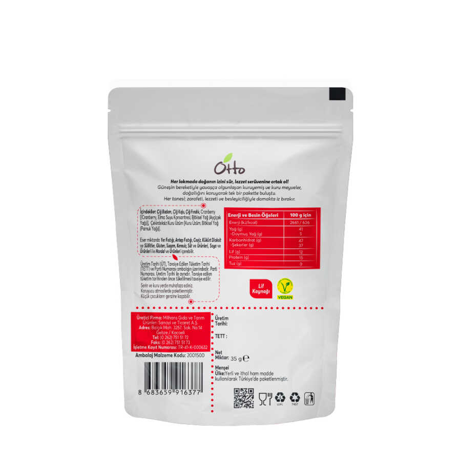 Otto Nuts Çiğ Karışık Kuruyemiş, içerisinde çiğ fındık, çiğ badem, çiğ kaju, cranberry ve sultani kuru üzüm barındırmaktadır. Besleyici ara öğünler için idealdir.