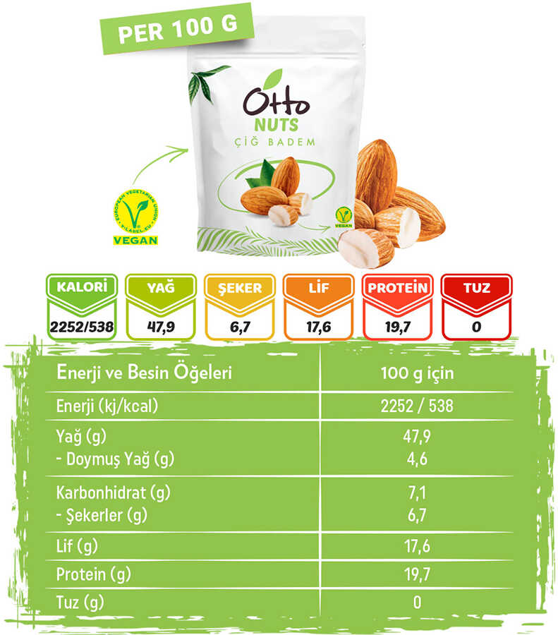 Vegan Çiğ Badem 40 g, bademin en doğal, işlenmemiş ve saf halini porsiyonluk ambalajda sunan sağlıklı bir enerji deposudur. Otto Nuts tarafından titizlikle seçilen bademler, hiçbir ısıl işlem (kavurma) veya tuzlama görmeden paketlenmiştir. Bu sayede bademin içeriğindeki doğal yağlar ve zengin E vitamini değerleri en yüksek seviyede korunur. Hayvansal yağ ve katkı maddesi içermeyen yapısıyla vegan beslenenler için idealdir.
